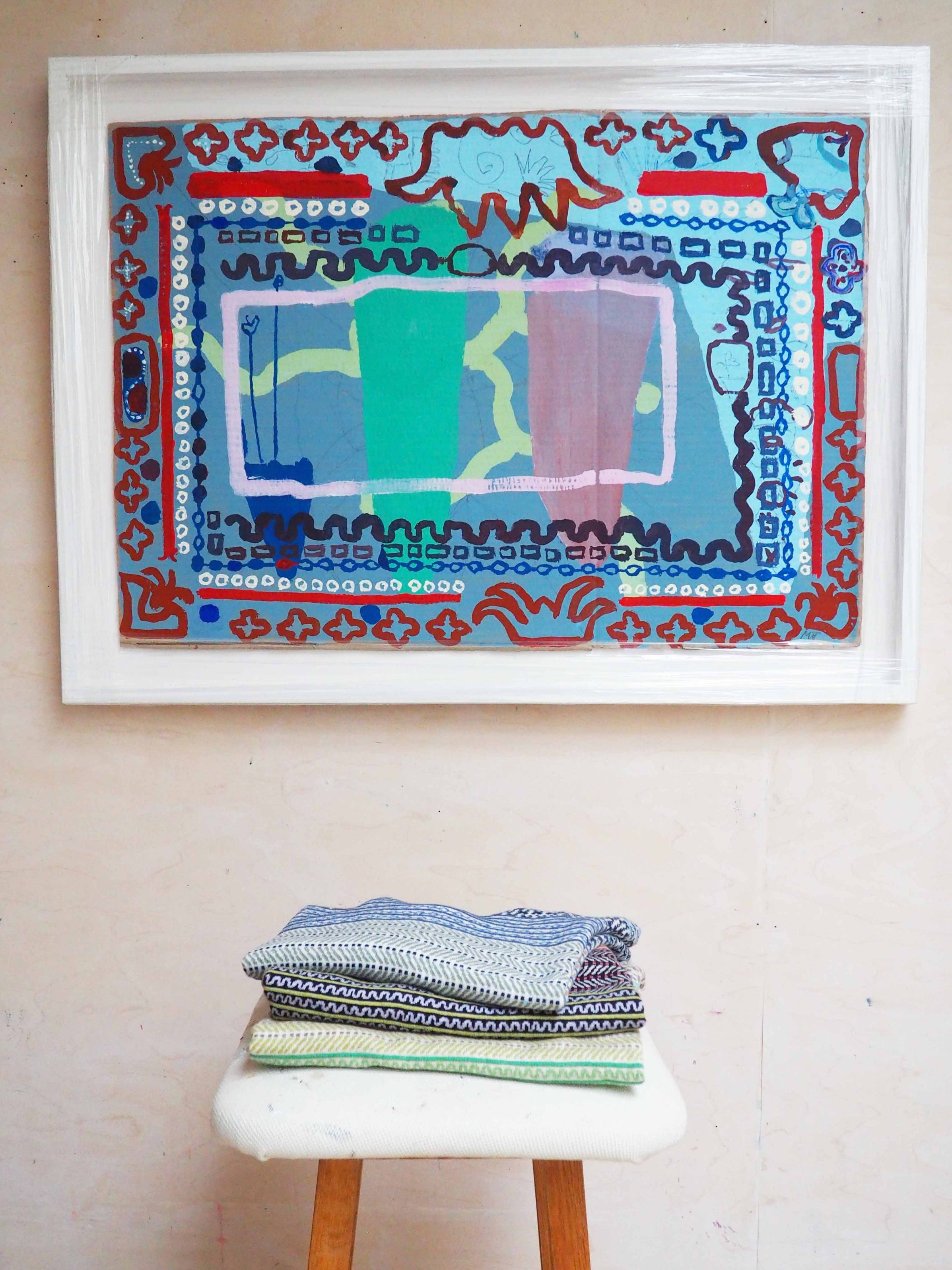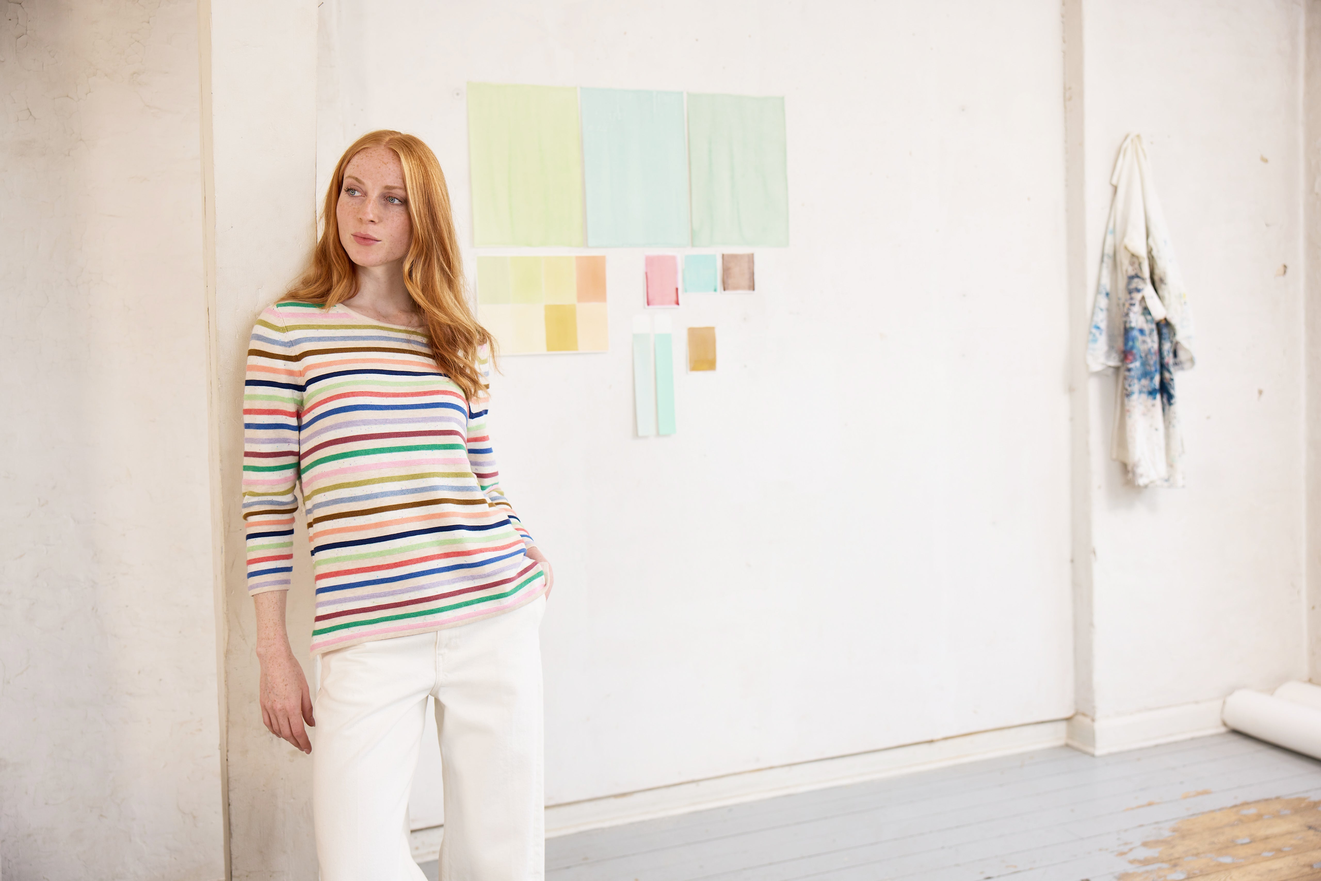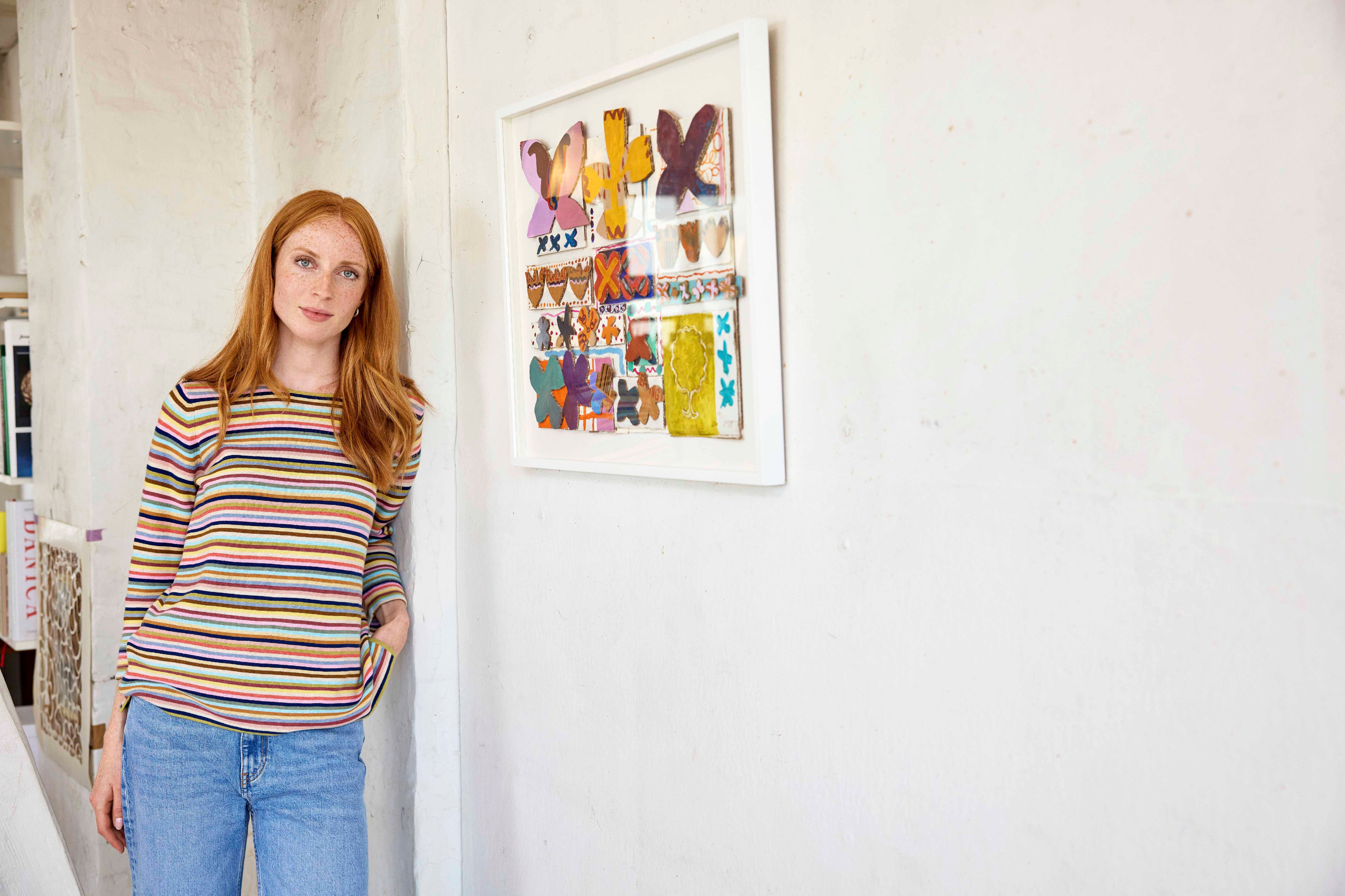 The carefully selected colour palette is inspired by the richly layered artworks of Thygesen - also with the artist's motif in mind we've worked with poetic imperfections as a signature for patterns and prints: small slanted flowers and dancing lines in our knitted patterns, as well as jersey prints with hand-painted, energetic brushstrokes and flowery fields created with airy gouache and vivid crayon.